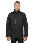 8,000 mm waterproofness/800 g breathability; 100% polyester two-tone texture; Bonded with birdseye mesh, 8.8 oz./yd2/300 gsm; soft touch rib inner collar and storm cuffs with adjustable tabs; centre front zipper with metal zipper pulls; square metal rivet details on front and back armhole; pocket flaps with side entry zippered pockets; audio port access through inside left pocket;